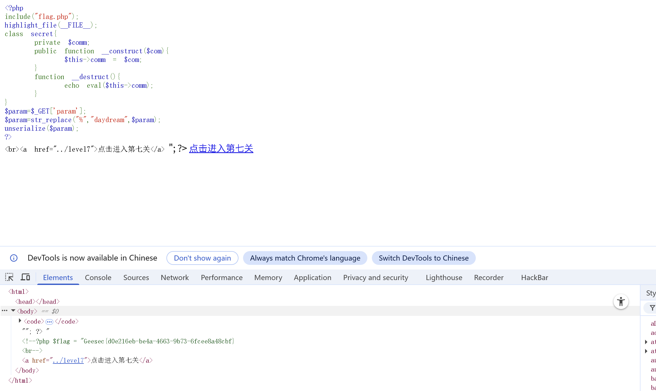 大写:用 大写的S,反序列化时 PHP 会自动把 \00 解析成空字符,精准匹配私有属性 $comm,从而让 eval() 执行传入的 system("tac flag.php"); 命令。这道题的思路是,在创建对象时传入的comm,值为system("tac flag.php");,在脚本结束后触发__destruct()方法后就会使用eval来执行system("tac flag.php");就得到flag了